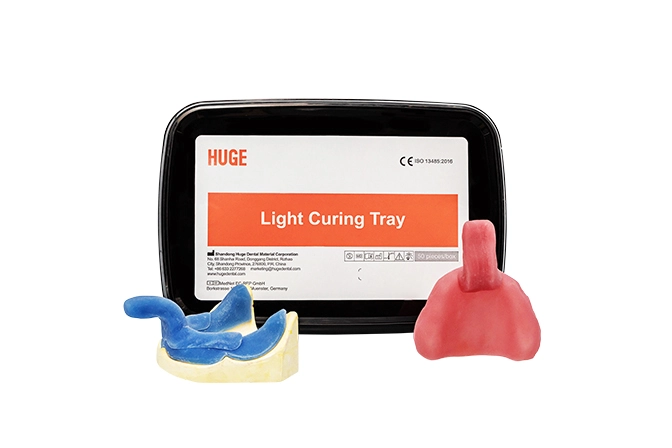 Light Curing Tray ist eine Reihe von leicht härten den Harzen, die zur Herstellung einzelner Schalen für den Abdruck, temporäre Grundplatten zum Anordnen von Zähnen und Beiß platten zum abnehmbaren Einstellen von Prothesen angezeigt sind.